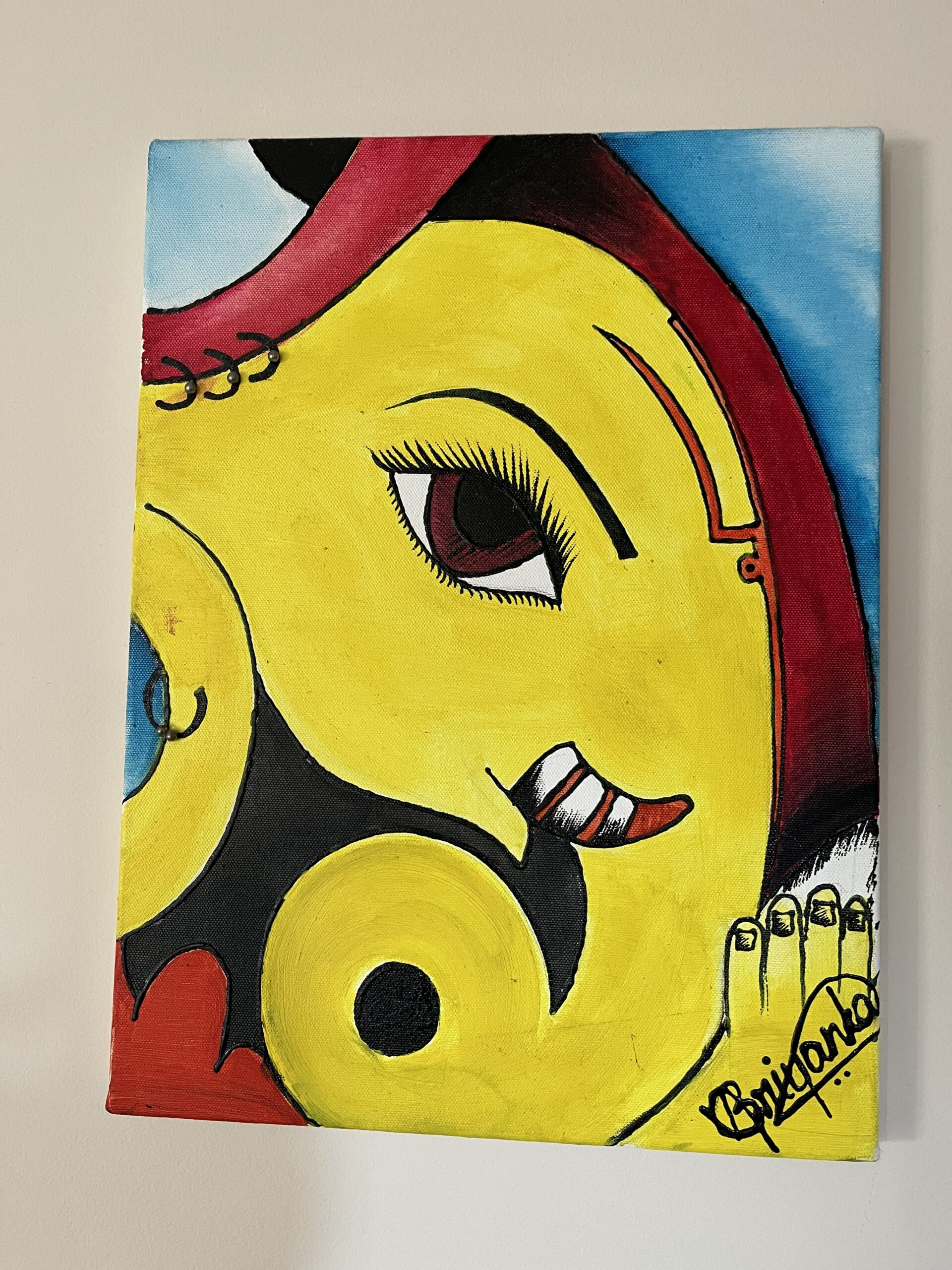 The artist’s confident brushwork brings Ganesha to life through expressive details — the delicately lashed eye gazing with quiet wisdom, the ornate earring, the signature broken tusk, and the raised hand offering blessings. The bold black outlines and vivid primary palette give this piece the energy of modern pop art while remaining deeply rooted in Indian spiritual tradition.