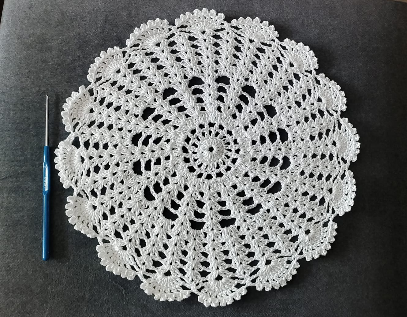 Luminous, airy and breathtakingly detailed — this medium to large circular crochet doily is worked in a silky white thread that catches light beautifully, giving it an almost pearl-like quality that sets it apart from ordinary cotton doilies.